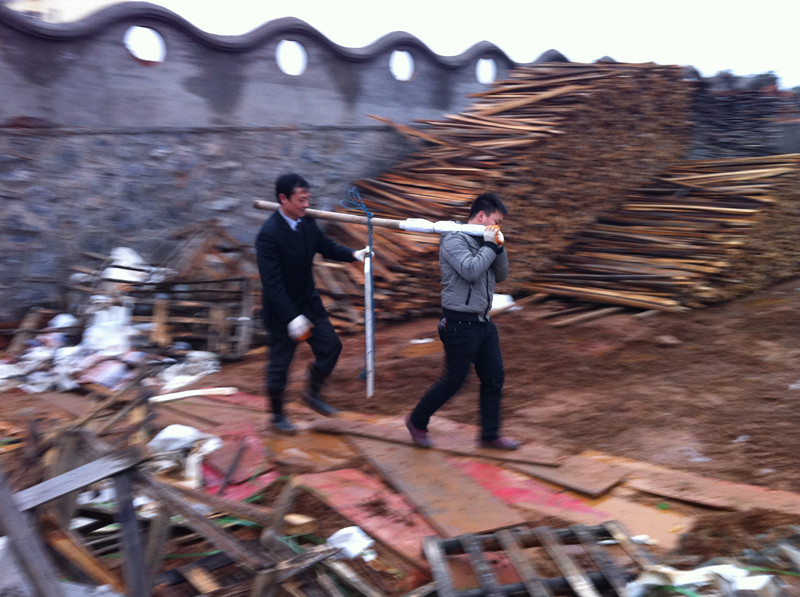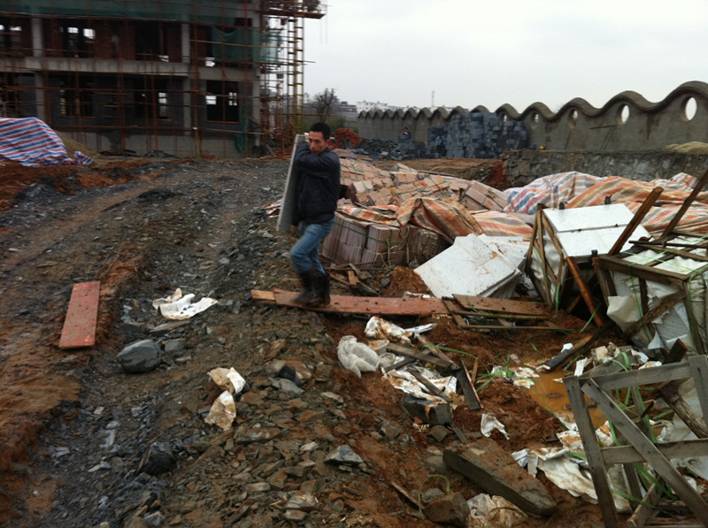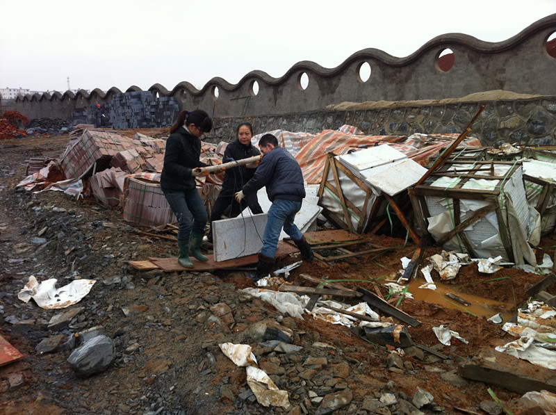 共青城兒童村項目管理人員冒雨工作場景